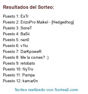 Lista de participantes: DarKpoweR, SoneT, BaSii, kamar0n, NyTro, nan0, retobato, Me la comes? :), ExTr, ErizoPro Maikel - [Hedgedhog], v1tu, Pampa.