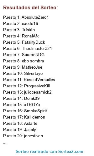 Lista de participantes: IrvintheGamer, TheRealPunk, Silvertoyo, MatheoJse, ExtranguladoR, JKrauser879, sonico rozek, AbsoluteZero1, Alextensa, DaWn In In FeRnO, tigre toño xD, Dométrius, Trístán, juliocesarnick2, SauronNDG, FatalityDuck, ODST Omar, Theelmaster321, deadOFwolf, danielxD2412, jonestiven, xxdemevilxx, xXSNPXx, LeysaP, pereza2, perezajungla, ebo sombra, Gotenksssj3, Donik09, Rose dVersailles, DG InanimuS, BG VastoLord, exodo16, xTROYx, Jill Black, SKT T1 Cholo, Jaipify, ProgresiveKill, Darth Vader, Juan Soriano, Yasuki, NevaShot, Ekko dei futuro, Kail demon, SmokeSpirit, Astarte, RonalAfk, LR Happy Donuts, Anth3r, The Drops.
