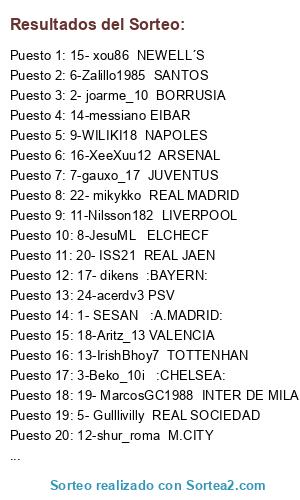 Lista de participantes: 1- SESAN :A.MADRID:, 2- joarme_10 BORRUSIA, 3-Beko_10i :CHELSEA:, 4-halop123 :BARÇA:, 5- Gulllivilly REAL SOCIEDAD, 6-Zalillo1985 SANTOS, 7-gauxo_17 JUVENTUS, 8-JesuML ELCHECF, 9-WILIKI18 NAPOLES, 10-ERBEZ08 AJAX, 11-Nilsson182 LIVERPOOL, 12-shur_roma M.CITY, 13-IrishBhoy7 TOTTENHAN, 14-messiano EIBAR, 15- xou86 NEWELL´S, 16-XeeXuu12 ARSENAL, 17- dikens :BAYERN:, 18-Aritz_13 VALENCIA, 19- MarcosGC1988 INTER DE MILAN, 20- ISS21 REAL JAEN, 21-Standbyx BETIS, 22- mikykko REAL MADRID, 23-Kerman10 M.UNITED, 24-acerdv3 PSV.