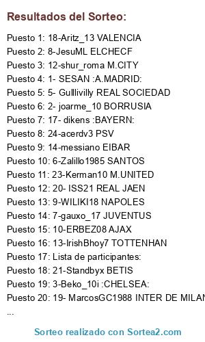 Lista de participantes: Lista de participantes:, 1- SESAN :A.MADRID:, 2- joarme_10 BORRUSIA, 3-Beko_10i :CHELSEA:, 4-halop123 :BARÇA:, 5- Gulllivilly REAL SOCIEDAD, 6-Zalillo1985 SANTOS, 7-gauxo_17 JUVENTUS, 8-JesuML ELCHECF, 9-WILIKI18 NAPOLES, 10-ERBEZ08 AJAX, 11-Nilsson182 LIVERPOOL, 12-shur_roma M.CITY, 13-IrishBhoy7 TOTTENHAN, 14-messiano EIBAR, 15- xou86 NEWELL´S, 16-XeeXuu12 ARSENAL, 17- dikens :BAYERN:, 18-Aritz_13 VALENCIA, 19- MarcosGC1988 INTER DE MILAN, 20- ISS21 REAL JAEN, 21-Standbyx BETIS, 22- mikykko REAL MADRID, 23-Kerman10 M.UNITED, 24-acerdv3 PSV.