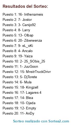 Lista de participantes: 1- JuuGoon , 2- 25_SObis_25 , 3- Canijo92 , 4- Ancalo , 5- DjTorete , 6- Mula, 7- Jostor , 8- Larry, 9- eL_oKi, 10- Ojeda , 11- AnDy , 12- Empty , 13- Olbap , 14- Blea , 15- MnstrTruckDrivr , 16- Inthenameis, 17- Lagares 4 , 18- Kingzell, 19- Yaiza, 20- Ziberwenza.