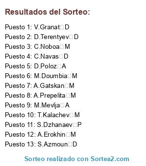 Lista de participantes: A.Erokhin M, A.Gatskan M, A.Prepelita M, C.Navas D, C.Noboa M, D.Poloz A, D.Terentyev D, M.Doumbia M, M.Mevlja A, S.Azmoun D, S.Dzhanaev P, T.Kalachev M, V.Granat D.