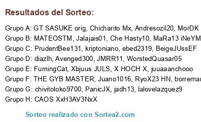 Lista de participantes: Juano1016, MATEOSTM, lalovelazquez9, PrudentBee131, ebed2319, GT SASUKE orig, WorstedQuasar05, CAOS XxH3AV3NxX, PanicJX, MorDK, RyoX23 HN, Avenged300, THE GYB MASTER, Jalajais01, Chicharito Mx, juuaaanchooo, Xbjuus JULS, chivitoloko9700, diazlh, borreman4, kriptoniano, Andresozil20, JMRR11, FumingCat, jadh13, Che Hasty10, X HOCH X, BeigeJUssEF, MaRa13 iNeYMaRx.