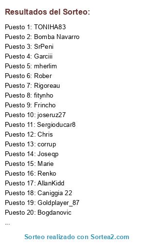 Lista de participantes: Marie, Renko, Versetty, Rober, Frincho, Garciii, Chris, Frade04, Bomba Navarro, Tonijaca, Sergioducar8, Alphadog, Manu, KobeSFC, Caniggia 22, AllanKidd, SrPeni, Alvaro, joseruz27, corrup, fitynho, Alvthebest, Goldplayer_87, mherlim, AgnieszkaGry, TONIHA83, Zztop, Bogdanovic, Joseqp, Rigoreau.