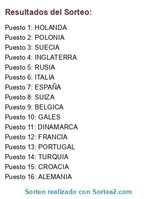 Lista de participantes: CROACIA, HOLANDA, ESPAÑA, ITALIA, INGLATERRA, FRANCIA, SUIZA, ALEMANIA, PORTUGAL, BELGICA, RUSIA, GALES, TURQUIA, DINAMARCA, POLONIA, SUECIA.