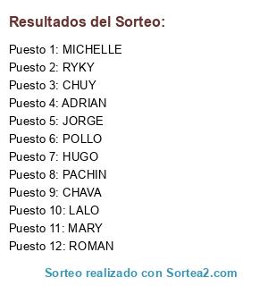 Lista de participantes: ROMAN, ADRIAN, HUGO, RYKY, LALO, MICHELLE, POLLO, MARY, CHUY, JORGE, CHAVA, PACHIN.