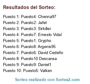 Lista de participantes: Puesto1: Grypho, Puesto2: Jafet, Puesto3: Sirkiller, Puesto4: Chenna97, Puesto5: Valken, Puesto6: David Cedeño, Puesto7: Ernesto Vidal, Puesto8: Argenis95, Puesto9: Daniel1, Puesto10 Descansa.