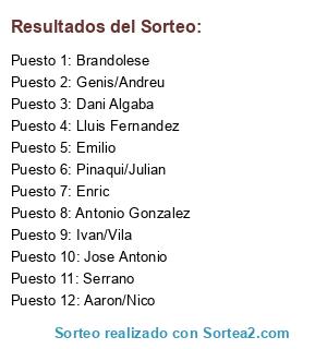 Lista de participantes: Aaron/Nico, Ivan/Vila, Enric, Emilio, Jose Antonio, Dani Algaba, Antonio Gonzalez, Lluis Fernandez, Genis/Andreu, Pinaqui/Julian, Brandolese, Serrano.