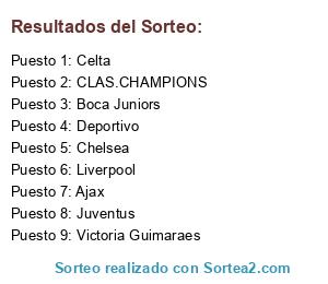 Lista de participantes: Liverpool, Boca Juniors, Deportivo, Celta, Ajax, Chelsea, Juventus, Victoria Guimaraes, CLAS.CHAMPIONS.