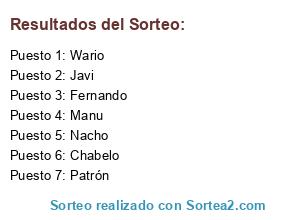 Lista de participantes: Javi, Chabelo, Fernando, Manu, Nacho, Patrón, Wario.