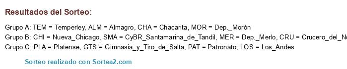 Lista de participantes: ALM = Almagro, CHA = Chacarita, MER = Dep._Merlo, MOR = Dep._Morón, LOS = Los_Andes, CHI = Nueva_Chicago, PLA = Platense, TEM = Temperley, CRU = Crucero_del_Norte, PAT = Patronato, GTS = Gimnasia_y_Tiro_de_Salta, SMA = CyBR_Santamarina_de_Tandil.