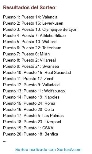 Lista de participantes: Puesto 1: CSKA, Puesto 2: Villarreal, Puesto 3: Inter de Milan, Puesto 4: Sevilla, Puesto 5: Las Palmas, Puesto 6: Milan, Puesto 7: Athletic Bilbao, Puesto 8: Everton, Puesto 9: Valladolid, Puesto 10: Watford, Puesto 11: Wolfsburgo, Puesto 12: Zenit, Puesto 13: Olympique de Lyon, Puesto 14: Valencia, Puesto 15: Real Sociedad, Puesto 16: Leverkusen, Puesto 17: Oporto, Puesto 18: Benfica, Puesto 19: Napoles, Puesto 20: Celta, Puesto 21: Swansea, Puesto 22: Tottenham, Puesto 23: Liverpool, Puesto 24: Roma.