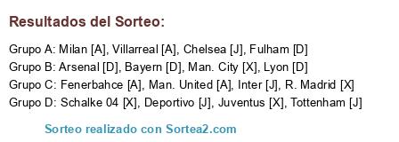 Lista de participantes: Arsenal [D], Deportivo [J], Fenerbahce [A], Fulham [D], Inter [J], Juventus [X], Lyon [D], Man. City [X], Man. United [A], Milan [A], R. Madrid [X], Bayern [D], Schalke 04 [X], Tottenham [J], Villarreal [A], Chelsea [J].