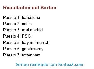 Lista de participantes: real madrid, celtic, barcelona, PSG, tottenham, bayern munich, galatasaray.
