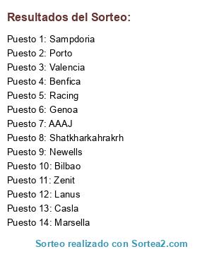 Lista de participantes: Sampdoria, Genoa, Porto, Zenit, Racing, Bilbao, Benfica, Valencia, Lanus, Newells, AAAJ, Casla, Marsella, Shatkharkahrakrh.