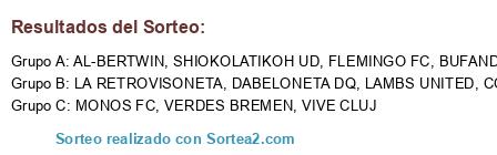 Lista de participantes: FLEMINGO FC, BUFANDAS FC, LA RETROVISONETA, AL-BERTWIN, VIVE CLUJ, LAMBS UNITED, VERDES BREMEN, DABELONETA DQ, MONOS FC, CORREAS SAD, SHIOKOLATIKOH UD.