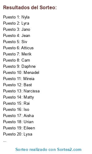 Lista de participantes: Siv, Nyla, Iso, Mireia, Atticus, Dorian, Eileen, Zarek, Bast, Lysa, Aisha, Cam, Daphne, Jano, Jean, Urian, Menadel, Lyra, Merik, Narcissa, Rai, Matty.