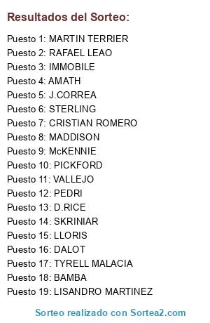 Lista de participantes: LLORIS, PICKFORD, SKRINIAR, CRISTIAN ROMERO, TYRELL MALACIA, DALOT, LISANDRO MARTINEZ, VALLEJO, PEDRI, D.RICE, McKENNIE, MADDISON, BAMBA, AMATH, IMMOBILE, J.CORREA, MARTIN TERRIER, RAFAEL LEAO, STERLING.