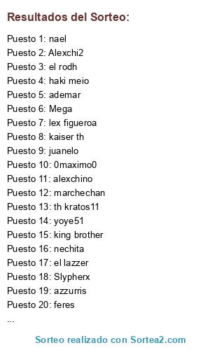 Lista de participantes: Luque, Pablocess, Mega, Zaraki, Slypherx, monkey, kizan, ademar, johan traum, azzurris, butch vortex, 0maximo0, king brother, Markdeath, alexchino, aaleqs, chetos bolitas, juanelo, mawachi, marchechan, gearspeach, kaiser th, gabriel xuxita, lex figueroa, feres, morph th, darjack, nechita, el lazzer, the marine, yoye51, haki meio, Raziel, Alexchi2, roko, nael, jair, kory, el rodh, karli th, th kratos11.