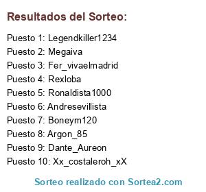 Lista de participantes: Fer_vivaelmadrid, Argon_85, Ronaldista1000, Xx_costaleroh_xX, Megaiva, Rexloba, Boneym120, Legendkiller1234, Andresevillista, Dante_Aureon.