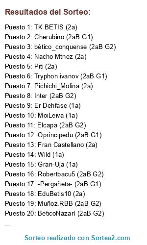 Lista de participantes: Mendaza (1a), Muñoz.RBB (2aB G2), EduBetis10 (2a), 19dani07 (1a), Elcapa (2aB G2), MoiLeiva (1a), bético_conquense (2aB G2), German BubuBetis (1a), Barbarinetis (2a), Inter (2aB G2), Racebes (2aB G1), Pichichi_Molina (2a), Wild (1a), Jlas (2a), Oprincipedu (2aB G1), -Pergañeta- (2aB G1), Senver (2aB G1), Barksdale (1a), Piti (2a), Gran-Uja (1a), Tryphon ivanov (2aB G1), Teskiyá (2a), Nacho Mtnez (2a), BetisdeEuropa (2aB G2), BeticoNazarí (2aB G2), TK BETIS (2a), HUGO STiGLiTZ (2aB G2), Fran Castellano (2a), ViTillo (2aB G1), Er Dehfase (1a), Cherubino (2aB G1), Robertbacu5 (2aB G2).