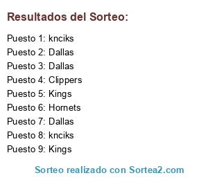 Lista de participantes: Celtics(9), Clippers(15), Heat(11), Hornets(126), Jazz(16), Kings(25), knciks(15), Dallas(14), Spurs(24).