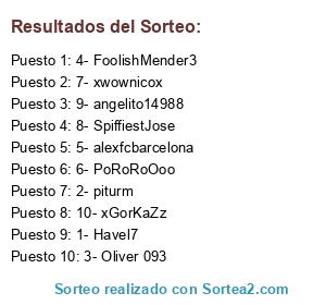 Lista de participantes: 1- Havel7, 2- piturm, 3- Oliver 093, 4- FoolishMender3, 5- alexfcbarcelona, 6- PoRoRoOoo, 7- xwownicox, 8- SpiffiestJose, 9- angelito14988, 10- xGorKaZz.