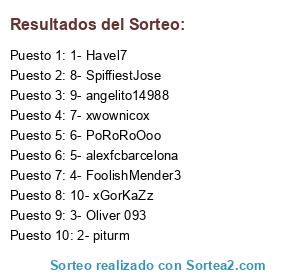 Lista de participantes: 1- Havel7, 2- piturm, 3- Oliver 093, 4- FoolishMender3, 5- alexfcbarcelona, 6- PoRoRoOoo, 7- xwownicox, 8- SpiffiestJose, 9- angelito14988, 10- xGorKaZz.