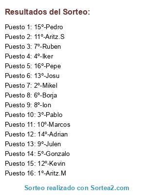 Lista de participantes: 1º-Aritz.M, 2º-Mikel, 3º-Pablo, 4º-Iker, 5º-Gonzalo, 6º-Borja, 7º-Ruben, 8º-Ion, 9º-Julen, 10º-Marcos, 11º-Aritz.S, 12º-Kevin, 13º-Josu, 14º-Adrian, 15º-Pedro, 16º-Pepe.