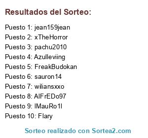 Lista de participantes: 666x100pre, AlFrEDo97, Azulleviing, bricosky, darceuz, demonlobo, eljuanr, Flary, FreakBudokan, furyztar, jean159jean, kalel1, lMauRo1l, LordKasenjo, luis288, maestrosatan, Nikaros, pachu2010, pogonyuto1, S4latin0x 1, S4latin0x 2, S4latin0x 3, sauron14, Serack666, wiliansxxo, xTheHorror, ZirefroxD.