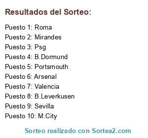 Lista de participantes: B.Dormund, Psg, Roma, M.City, Valencia, Sevilla, Mirandes, B.Leverkusen, Arsenal, Portsmouth.