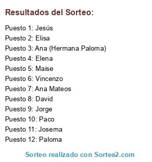 Lista de participantes: Elisa, Elena, David, Vincenzo, Ana (Hermana Paloma), Josema, Jesús, Jorge, Ana Mateos, Paco, Maise, Paloma.