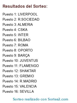 Lista de participantes: LIVERPOOL, BILBAO, R.SOCIEDAD, CSKA, GREMIO, FLAMENGO, SHAKTAR, VALENCIA, ROMA, INTER, JUVENTUS, OPORTO, BARÇA, R.MADRID, ALMERIA, SEVILLA.