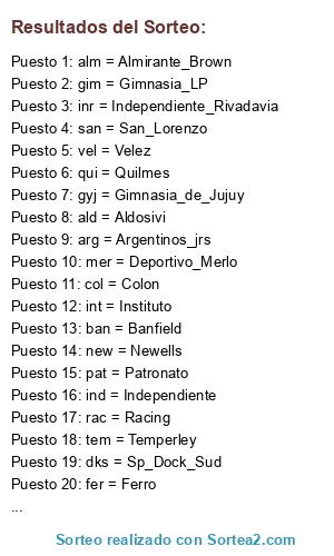 Lista de participantes: all = All_Boys, alm = Almirante_Brown, atl = Atletico_Tucuman, ald = Aldosivi, bou = Boca_Unidos, cen = Rosario_Central, col = Colon, arg = Argentinos_jrs, dks = Sp_Dock_Sud, inr = Independiente_Rivadavia, itu = Ituzaingo, tig = Tigre, mer = Deportivo_Merlo, new = Newells, ssj = San_Martin_de_SJ, tem = Temperley, tir = Tiro_Federal, uni = Union_de_Santa_Fe, qui = Quilmes, sar = Sarmiento_de_Junin, est = Estudiantes_LP, rac = Racing, riv = River, lan = Lanus, bel = Belgrano, def = Defensa_y_Justicia, cha = Chacarita, ars = Arsenal, ban = Banfield, boc = Boca, fer = Ferro, gim = Gimnasia_LP, gyj = Gimnasia_de_Jujuy, god = Godoy_Cruz, hur = Huracan, ind = Independiente, int = Instituto, pat = Patronato, san = San_Lorenzo, vel = Velez.