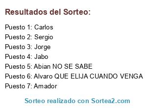 Lista de participantes: Amador, Alvaro QUE ELIJA CUANDO VENGA, Abian NO SE SABE, Carlos, Jabo, Jorge, Sergio.