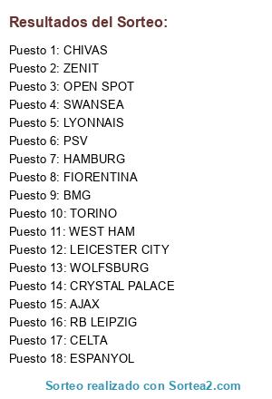 Lista de participantes: BMG, CRYSTAL PALACE, PSV, CELTA, CHIVAS, ZENIT, SWANSEA, WEST HAM, AJAX, WOLFSBURG, HAMBURG, FIORENTINA, ESPANYOL, LYONNAIS, LEICESTER CITY, TORINO, RB LEIPZIG, OPEN SPOT.