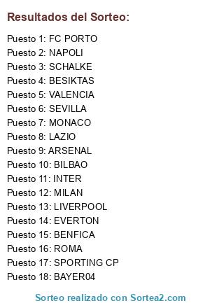 Lista de participantes: MONACO, ARSENAL, ROMA, VALENCIA, FC PORTO, INTER, NAPOLI, SEVILLA, BAYER04, BESIKTAS, SPORTING CP, BILBAO, MILAN, LAZIO, LIVERPOOL, BENFICA, EVERTON, SCHALKE.