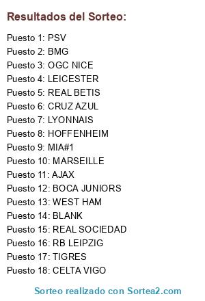 Lista de participantes: BOCA JUNIORS, MIA#1, BMG, AJAX, HOFFENHEIM, PSV, LEICESTER, MARSEILLE, REAL SOCIEDAD, RB LEIPZIG, CELTA VIGO, REAL BETIS, WEST HAM, OGC NICE, TIGRES, LYONNAIS, CRUZ AZUL, BLANK.