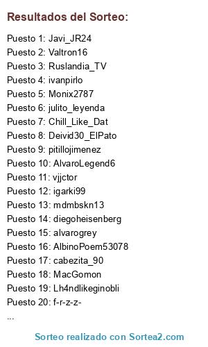 Lista de participantes: Ruslandia_TV, f-r-z-z-, julito_leyenda, Javi_JR24, Monix2787, diegoheisenberg, alvarogrey, igarki99, ivanpirlo, AlvaroLegend6, pitillojimenez, hectorcolchonero, adri_LAFiebre_YT, Deivid30_ElPato, mdmbskn13, Lh4ndlikeginobli, cabezita_90, vjjctor, AlbinoPoem53078, Sedkush, Valtron16, MacGomon, DanyaZaytsev624, Chill_Like_Dat.