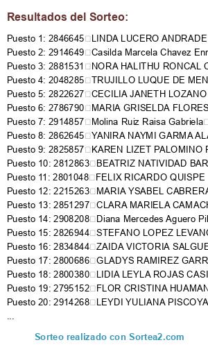 Lista de participantes: 2803547 3LADYS ESPERANZA LOPEZ GAMARRA 5078 - MARISOL HUAMAN CONDE, 16808 ACEVEDO PANEZ JOVITA ISABEL 5091 - YRMA DORIS PAREJA CHUQUIURE, 2346162 ACUNA AQUINO MARIA DEL PILAR 5077 - CENINA FLORINDA POMA QUISPE, 2826159 ADRIANA NICOLE AVILA TORRES 5083 - GABRIELA DIANA EVA MALASQUEZ LOPEZ, 2793704 AIDA AMARINGO PINA 5090 - EVELIN KARINA LOPEZ CARRILLO, 2903729 AKEMY MARGARITA ORELLANA SHIMABUKURO 5081 - YENI VILLAVICENCIO HUARACA, 2849032 ALBA ROSSINA ROSARIO GARCIA 5084 - JESSICA DE LAMA ZARATE, 2779170 ALBERTO JARAMILLO PADILLA 5087 - MARGOT SOLEDAD CUEVA VILLANUEVA, 2050477 ALBORNOZ VASQUEZ DE SOTOMAYOR SUSY 5076 - ROSA MARIA RAMOS LOZANO, 2890081 ALEIDA CHUMPITAZ MORA 5089 - IRMA BEATRIZ GONZALES FARFAN DE ZAVALA, 2880686 ALEJANDRA JOSE GIMENEZ COLMENAREZ 5075 - NATIVIDAD OCC QUILO, 2111107 ALEJANDRA ROSA COILA TAQUIRE 5082 - NELLY TARCILA AMARO CURI, 2843905 ALEJANDRA SORAIDA LETURIA HERRERA 5075 - NATIVIDAD OCC QUILO, 2890162 ALEJANDRO EVER TAMAYO ROJAS 5091 - YRMA DORIS PAREJA CHUQUIURE, 2903314 ALEXANDER OMAR ANTON AREVALO 5087 - MARGOT SOLEDAD CUEVA VILLANUEVA, 2854340 ALEXANDRA ESTHER TORRES CARDENAS 5087 - MARGOT SOLEDAD CUEVA VILLANUEVA, 2826774 ALEXANDRA REYES SOTELO 5078 - MARISOL HUAMAN CONDE, 2904376 ALEXANDRA RUIZ MOZOMBITE 5084 - JESSICA DE LAMA ZARATE, 2912424 Alexandra Ruiz tarazona 5079 - NOELIA YANINA GARCIA MEDINA, 2783843 ALFREDO AGUILAR HUAMANI 5075 - NATIVIDAD OCC QUILO, 2879126 ALFREDO ROSALES ALCANTARA 5091 - YRMA DORIS PAREJA CHUQUIURE, 2785640 ALICIA ISABEL TORRES GOVEA 5089 - IRMA BEATRIZ GONZALES FARFAN DE ZAVALA, 2799366 ALICIA NATIVIDAD CHUMPITAZ RUEDA 5088 - MARIA CONSUELO ANICAMA PEREZ, 2062109 ALMEYDA QUISPE LEONOR 5091 - YRMA DORIS PAREJA CHUQUIURE, 2867762 AMABLE RAMIREZ CORREA 5079 - NOELIA YANINA GARCIA MEDINA, 2784250 AMANCIO RUPAY ARONI 5087 - MARGOT SOLEDAD CUEVA VILLANUEVA, 2785829 AMEIIA RAMIREZ PENA MOTIVOS PERSONALES 5079 - NOELIA YANINA GARCIA MEDINA, 2786059 ANA CECILIA CHUMPITAZ ARIAS 5088 - MARIA CONSUELO ANICAMA PEREZ, 2187919 ANA CECILIA LAZO NUNEZ 5090 - EVELIN KARINA LOPEZ CARRILLO, 2439467 ANACETA MARTA RIVERA VILCHEZ 5080 - MARINA AUSTRAGILDA SANCHEZ ESPINOZA, 2861473 ANA ERIKA RIOS GONZALEZ 5084 - JESSICA DE LAMA ZARATE, 2871215 ANA GOZAR DELGADO 5079 - NOELIA YANINA GARCIA MEDINA, 2793409 ANA INES TOMAS DELGADO 5081 - YENI VILLAVICENCIO HUARACA, 2906007 ANAIS DE LOS ANGELES RUIZ OCHOA 5087 - MARGOT SOLEDAD CUEVA VILLANUEVA, 2863937 ANAIS TELLO MOZO 5089 - IRMA BEATRIZ GONZALES FARFAN DE ZAVALA, 2842622 ANALY LANDEO MANUELO 5084 - JESSICA DE LAMA ZARATE, 2782344 ANA MARIA ZACARIAS CARO 5080 - MARINA AUSTRAGILDA SANCHEZ ESPINOZA, 2865811 ANA MELBA OCAMPO MAZA 5083 - GABRIELA DIANA EVA MALASQUEZ LOPEZ, 2801077 ANA PAZ JUAREZ 5078 - MARISOL HUAMAN CONDE, 2872940 ANA SILVIA VELASQUEZ ANACLETO 5089 - IRMA BEATRIZ GONZALES FARFAN DE ZAVALA, 2904915 ANDREA CRISTHEL ECHEVARRIA PAREDES 5087 - MARGOT SOLEDAD CUEVA VILLANUEVA, 2822643 ANDREA LUCIA APAZA CHOCHABOTE 5081 - YENI VILLAVICENCIO HUARACA, 2793299 ANDREA MERCEDES ORTEGA BRICENO 5080 - MARINA AUSTRAGILDA SANCHEZ ESPINOZA, 2798387 ANDREA NICOLL RIVERA FALCONI 5082 - NELLY TARCILA AMARO CURI, 2208718 ANGELA AMELIA PERALTA AMARO 5082 - NELLY TARCILA AMARO CURI, 2866482 ANGELA MILAGROS CAMPOS RETES 5089 - IRMA BEATRIZ GONZALES FARFAN DE ZAVALA, 2822163 ANGELA NATIVIDAD POLO OBANDO 5075 - NATIVIDAD OCC QUILO, 2283196 ANGELICA ESTHER HUAPAYA JARA 5088 - MARIA CONSUELO ANICAMA PEREZ, 2818949 ANGELICA MARINA AVILA HUAMAN 5080 - MARINA AUSTRAGILDA SANCHEZ ESPINOZA, 2815694 ANGIE ALEXANDRA ZAPATA BRONCANO 5084 - JESSICA DE LAMA ZARATE, 2816389 ANGIE LORAYNI SANCHEZ ARAUJO 5081 - YENI VILLAVICENCIO HUARACA, 2902462 ANITA FAVIOLA UGAZ AZULA 5077 - CENINA FLORINDA POMA QUISPE, 2904041 ANJEL YESMING GUERRERO GONZALES 5085 - LUCIA ANTONIA BENITES ROCA, 2853661 ANNET MICHELLE CAJAS SANCHEZ 5082 - NELLY TARCILA AMARO CURI, 2797652 ANTHONY WESLY CABOS GONZALES 5082 - NELLY TARCILA AMARO CURI, 2810830 ANTOBIA JUSTO MARTIN 5080 - MARINA AUSTRAGILDA SANCHEZ ESPINOZA, 2786918 ANTONIA JUANA ARIAS LESCANO 5076 - ROSA MARIA RAMOS LOZANO, 2860373 ARACELY MARISOL PALOMINO SILVA 5079 - NOELIA YANINA GARCIA MEDINA, 2838705 ARIANA ANDREA CHAVARRIA ALEJANDRO 5079 - NOELIA YANINA GARCIA MEDINA, 2799547 ARMINDA MARIA BARTOLO TRINIDAD 5084 - JESSICA DE LAMA ZARATE, 2798889 ARTURO UCHARIMA DE LA CRUZ 5089 - IRMA BEATRIZ GONZALES FARFAN DE ZAVALA, 2835006 AURA JOSEFINA MORLES 5089 - IRMA BEATRIZ GONZALES FARFAN DE ZAVALA, 2224990 AURORA MORALES QUISPE DE ROJAS 5088 - MARIA CONSUELO ANICAMA PEREZ, 2880135 AVELINA PILAR PAREJA CHUQUIURE 5091 - YRMA DORIS PAREJA CHUQUIURE, 2384198 axel lorgio chavez torres 5090 - EVELIN KARINA LOPEZ CARRILLO, 2789248 AYDE JESUS HUAMAN PUERTA 5081 - YENI VILLAVICENCIO HUARACA, 2801068 BACILIA ELICIA LEON MENDOZA 5089 - IRMA BEATRIZ GONZALES FARFAN DE ZAVALA, 2249058 BEATRI CELIS REYNOSO AYALA 5079 - NOELIA YANINA GARCIA MEDINA, 43210 BEATRIZ BALLESTEROS AREVALO 5085 - LUCIA ANTONIA BENITES ROCA, 2904038 BEATRIZ ESPINOZA PINEDA 5077 - CENINA FLORINDA POMA QUISPE, 2885153 BEATRIZ HERMINIA ESTRADA YNDIGOYEN 5075 - NATIVIDAD OCC QUILO, 2807336 BEATRIZ LLACTAHUAMAN PILLACA 5076 - ROSA MARIA RAMOS LOZANO, 2852584 BEATRIZ MILAGROS RAMIREZ DUPUY 5084 - JESSICA DE LAMA ZARATE, 2812863 BEATRIZ NATIVIDAD BARBOZA OCC 5075 - NATIVIDAD OCC QUILO, 2864254 BEATRIZ ROSSANA CHOCANO MONTEVERDE 5084 - JESSICA DE LAMA ZARATE, 2857698 BEATRIZ VALLE CIRINEO 5090 - EVELIN KARINA LOPEZ CARRILLO, 2784222 BENIGNO FORTUNATO ARIAS POMALAZO 5076 - ROSA MARIA RAMOS LOZANO, 2875168 BERNADINA FLOR SANCHEZ SANCHEZ 5077 - CENINA FLORINDA POMA QUISPE, 2796672 BERTHA ALICIA CORREA CHUQUILIN 5084 - JESSICA DE LAMA ZARATE, 2862775 BILL ANDERSON GUEVARA VALENZUELA 5080 - MARINA AUSTRAGILDA SANCHEZ ESPINOZA, 2785327 BLANCA ISABEL FIGUEREDO POZA 5075 - NATIVIDAD OCC QUILO, 2685894 BLENDA YVANIA ALVA SOTO 5088 - MARIA CONSUELO ANICAMA PEREZ, 2832162 BRENDA BRIGGITH LEZAMETA REYNA 5082 - NELLY TARCILA AMARO C