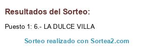 Lista de participantes: 1.- ANA PALACIOS, 2.- DOLORES CEBALLOS, 3.- Mª JOSE ISARRE, 4.- ANA PATRICIA CRESPO MATEOS, 5.- Mª NIEVES RUBIO AMAYA, 6.- LA DULCE VILLA.
