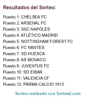 Lista de participantes: NOTTINGHAM FOREST FC, AS MONACO, FC NANTES, ARSENAL FC, SSC NAPOLES, SD EIBAR, JUVENTUS FC, CHELSEA FC, VALENCIA CF, ATLÉTICO MADRID, SD HUESCA, PARMA CALCIO 1913.