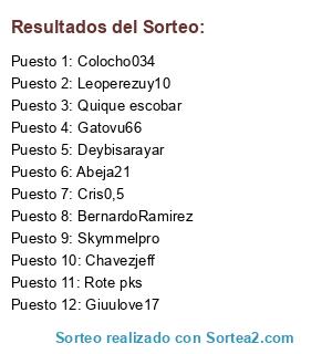 Lista de participantes: Gatovu66, BernardoRamirez, Giuulove17, Cris0,5, Chavezjeff, Abeja21, Deybisarayar, Colocho034, Quique escobar, Skymmelpro, Leoperezuy10, Rote pks.