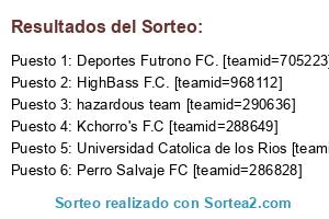 Lista de participantes: Perro Salvaje FC [teamid=286828], Universidad Catolica de los Rios [teamid=973035], Deportes Futrono FC. [teamid=705223], Kchorro's F.C [teamid=288649], HighBass F.C. [teamid=968112], hazardous team [teamid=290636].