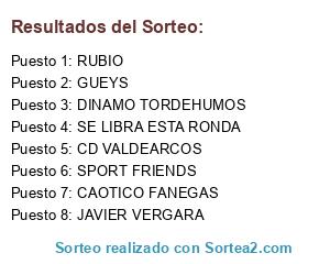 Lista de participantes: JAVIER VERGARA, SPORT FRIENDS, DINAMO TORDEHUMOS, CD VALDEARCOS, GUEYS, RUBIO, CAOTICO FANEGAS, SE LIBRA ESTA RONDA.