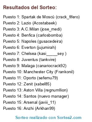 Lista de participantes: Aston Villa (regnumllion), Lazio (Acostabaek), Benfica (carlosbomba), Manchester City (Frankonil), Malaga (canariocrack92), Spartak de Moscú (crack_fifero), Oporto (sefemu79), Arsenal (javiii_11), Napoles (gusacedeira), Everton (jujumirah), A.C.Milan (jose_medi), Chelsea (kasi_____sey ), Zenit (xabel85), Juventus (tankvire), Anzhi (Arkhan99), Santos (nuevo manager).