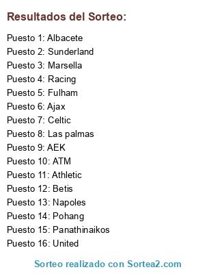 Lista de participantes: Racing, Marsella, Fulham, Ajax, United, Athletic, Panathinaikos, Sunderland, Celtic, Napoles, Las palmas, Betis, ATM, AEK, Pohang, Albacete.