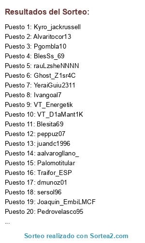 Lista de participantes: VT_Energetik, peppuz07, Traifor_ESP, Blesita69, YeraiGuiu2311, rauLzsheNNNN, sersol96, Tanito226, Kyro_jackrussell, Joaquin_EmbiLMCF, BlesSs_69, Alvaritocor13, kuyd10, Albergaps, Pgombla10, Ivangoal7, aalvarogllano_, Pedrovelasco95, Ghost_Z1sr4C, Palomotitular, dmunoz01, juandc1996, VT_D1aMant1K, IvaanM95.