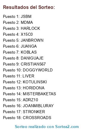 Lista de participantes: MDMA, LIVER, JUANGA, CROSSROADS, STRONKER, JSBM, ADRZ10, DANIGUAJE, CRISTIAN567, HARLOCK, JOANMIBLURAY, KOTULINSKI, KOBLAS, DOGGYWORLD, MISTERBAKETAS, X15C0, JANBROWN, HORIDONA.
