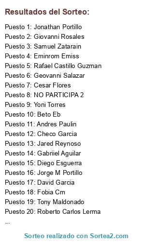 Lista de participantes: Eminrom Emiss, Rafael Castillo Guzman, Genaro Mendez Pereyra, Jorge M Portillo, Samuel Zatarain, Cesar Flores, Jonathan Portillo, Fobia Cm, Yoni Torres, Roberto Carlos Lerma, Diego Esguerra, Beto Eb, Checo Garcia, Geovanni Salazar, David Garcia, Tony Maldonado, Giovanni Rosales, Gabriiel Aguilar, Andres Paulin, Jared Reynoso, NO PARTICIPA 1, NO PARTICIPA 2.